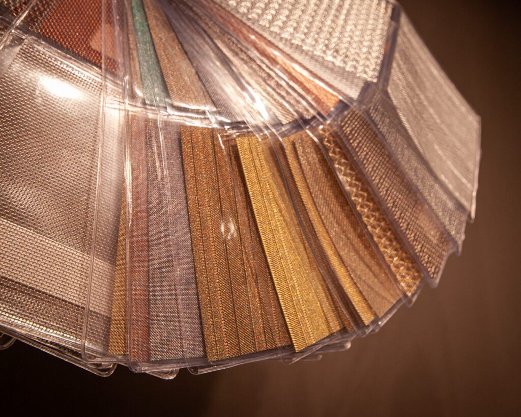 Sprezzatura Intarsio (Gelamineerd glas met inlay): Dit product combineert de schoonheid van lint, stof, draad of raster materiaal dat zorgvuldig wordt gelamineerd tussen twee glasplaten. Deze techniek creëert een uniek en complex ontwerp, waarbij de textuur van de stof extra dimensie toevoegt aan de elegante glasstructuur.